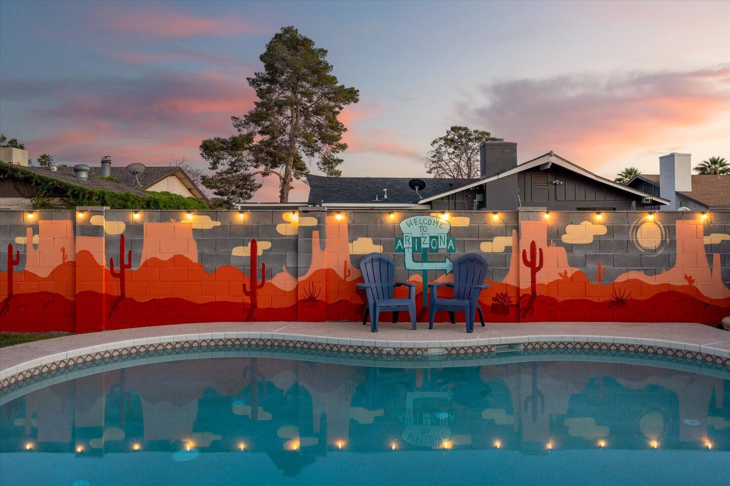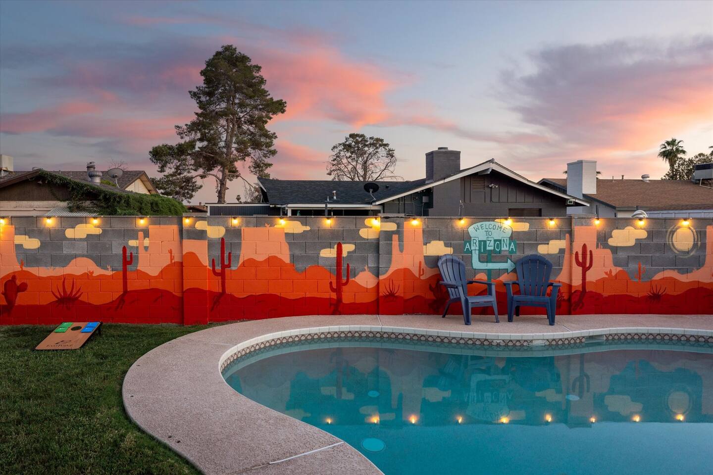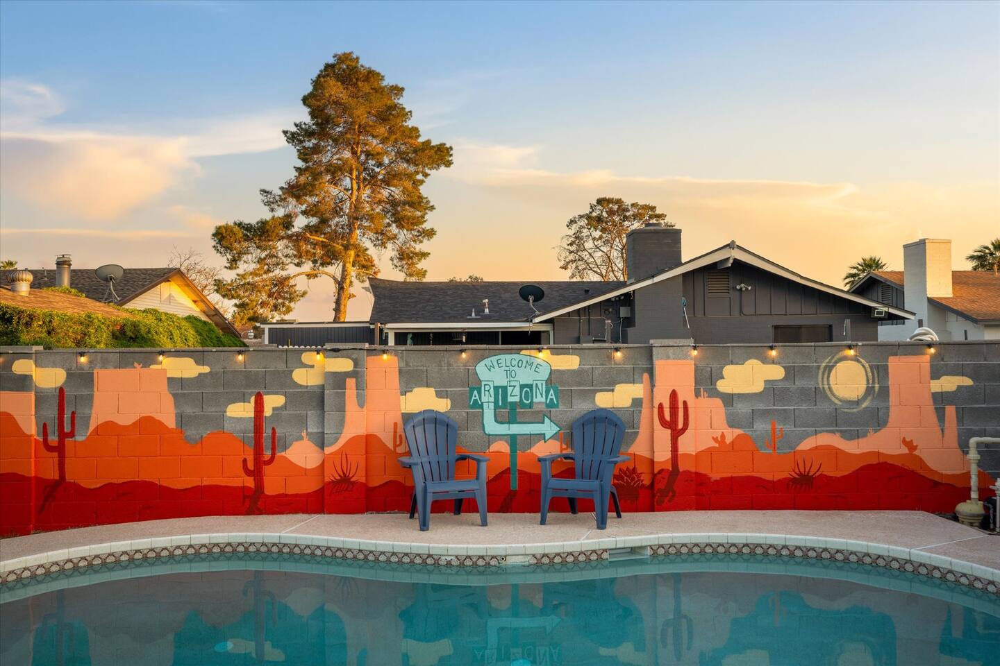Modern 3BR/2BA home with a private pool, fenced dog-friendly yard, and a glowing mural patio for nights outside. Enjoy super-fast Wi-Fi, smart TVs, a fully stocked kitchen, in-home laundry, and a Tesla/EV charger. Quiet street next to Cactus Park with quick I-17 access—easy trips to Sedona/Flagstaff, plus minutes to ASU West, Glendale shopping, and downtown Phoenix.