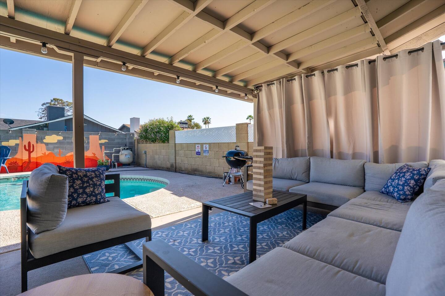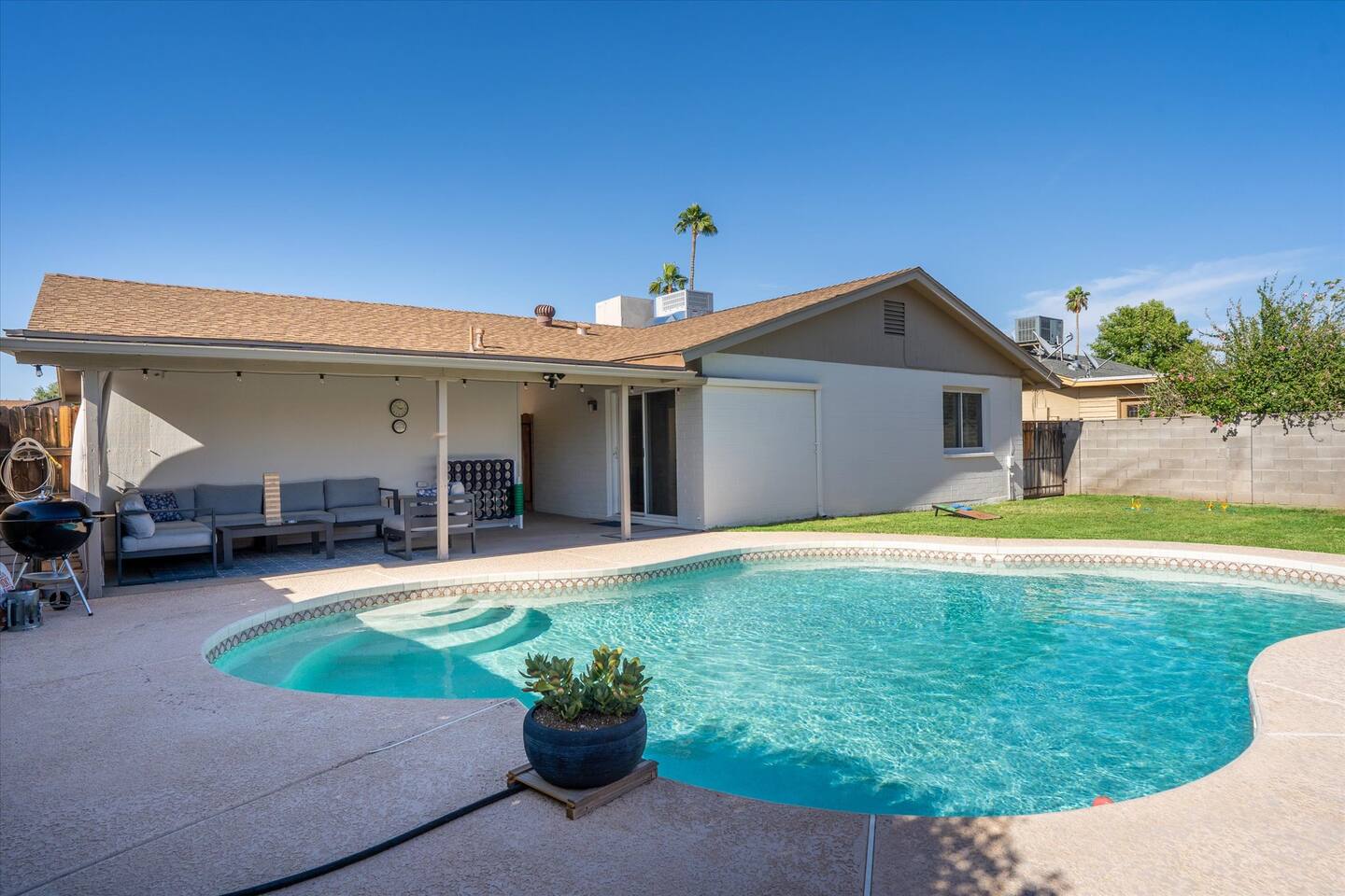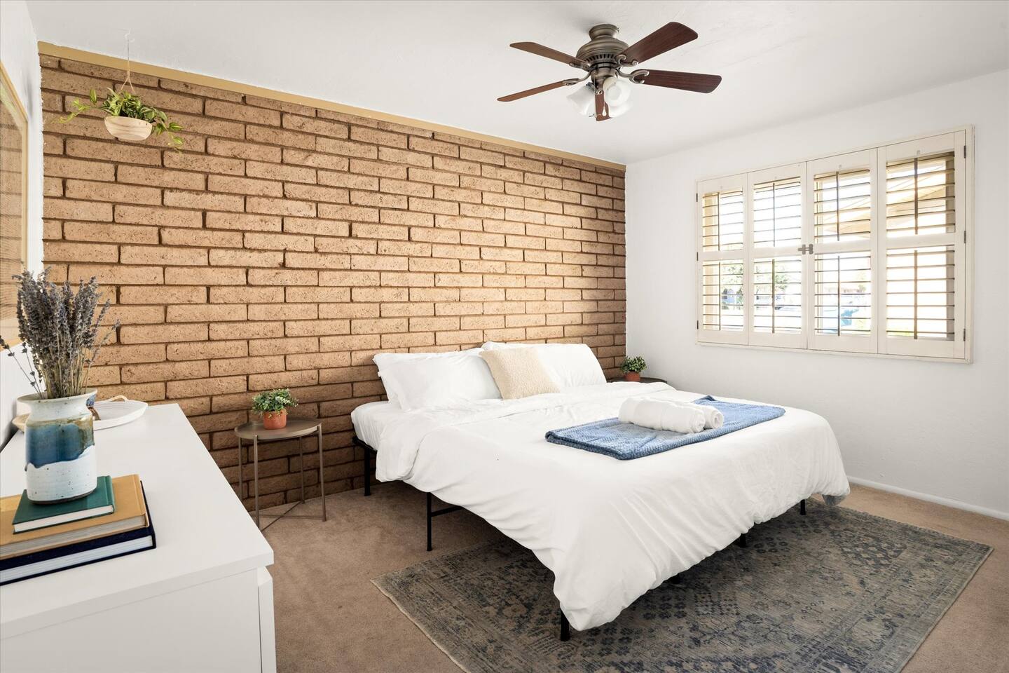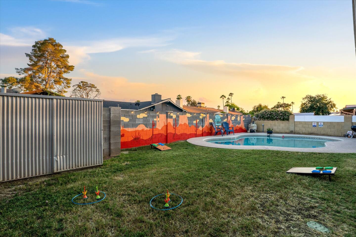 Why guests book this home - Private backyard retreat: pool, lounge seating, BBQ-ready patio, and nighttime glow lighting - Work-from-home ready: super-fast Wi-Fi + smart TVs throughout - Family + pet friendly: fenced yard (pets welcome with fee) - Easy logistics: keyless entry, in-home laundry, driveway parking, EV charging - Location advantage: steps to Cactus Park, quick I-17 access for day trips The home A comfortable, modern setup designed for groups who want a clean, easy stay—whether you’re here for family time, remote work, or a weekend reset. Backyard + pool Your own private space to unwind: swim, grill, and hang out under the patio lights after dark. The pool is serviced weekly. Location Quiet residential street next to Cactus Park. You’re close to ASU West, local restaurants, and Glendale shopping—and positioned well for downtown Phoenix and day trips north. Safety note No lifeguard on duty. Swim at your own risk and supervise children at all times.