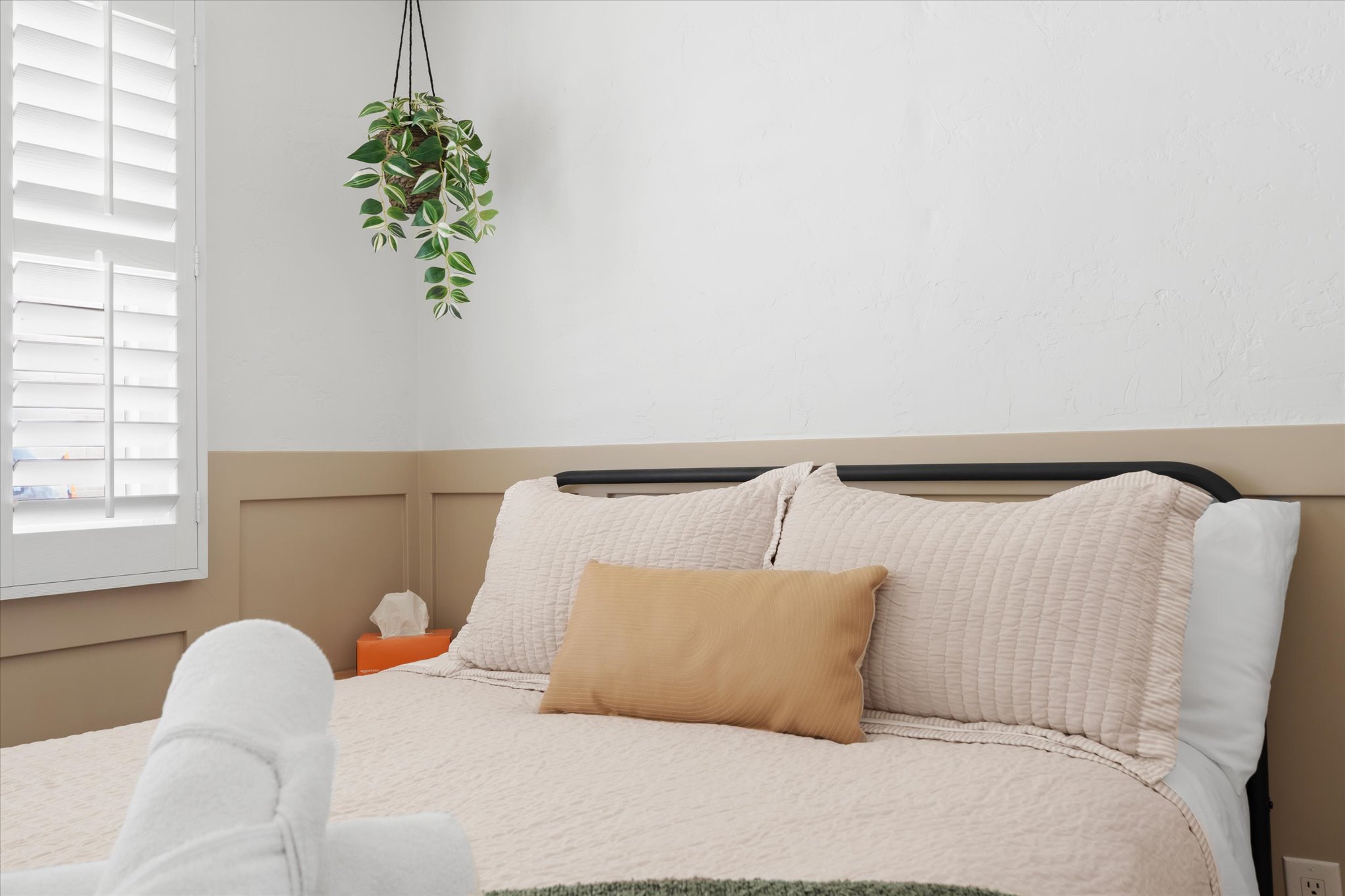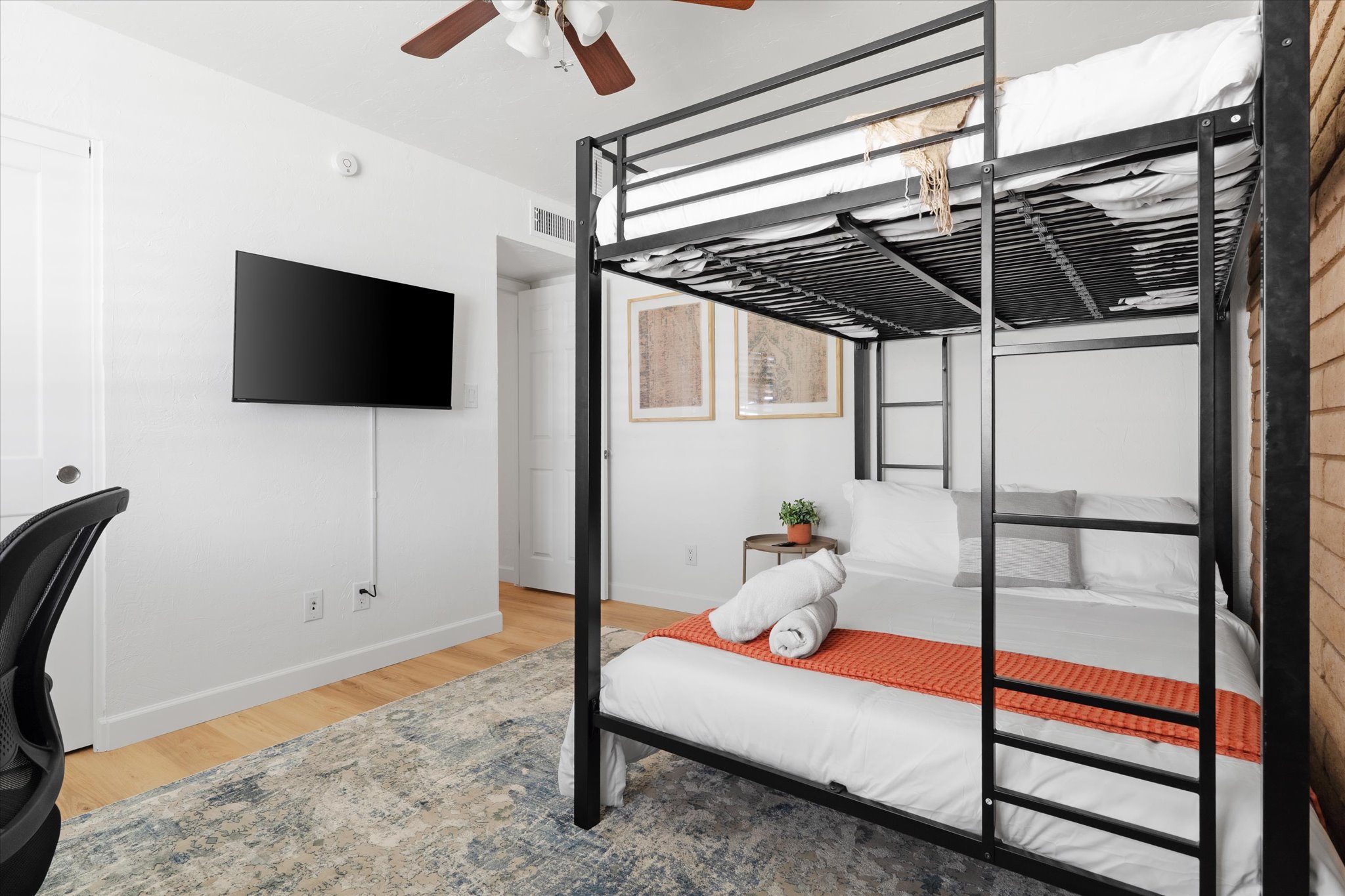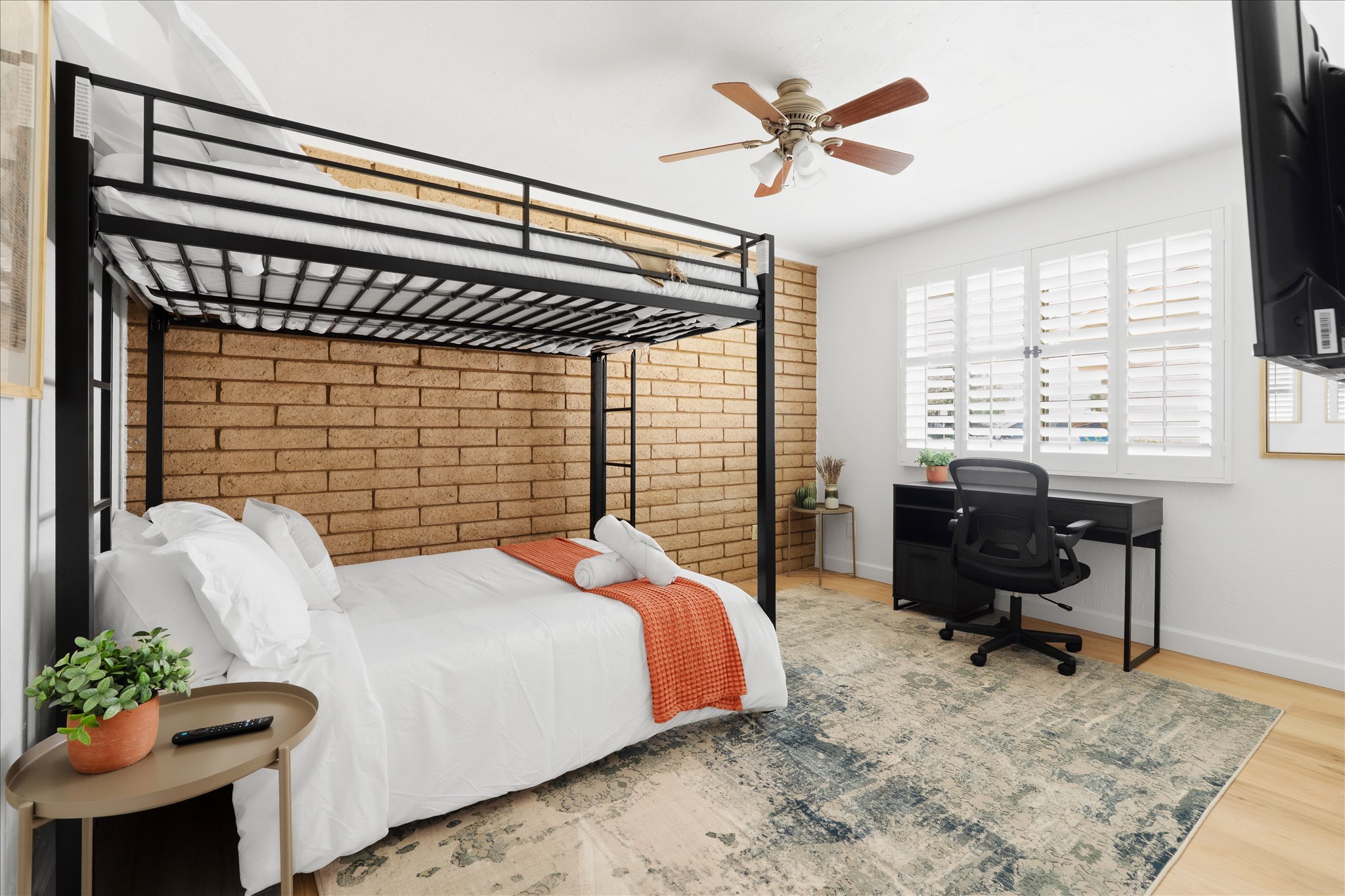 Why guests book this home: private pool, covered patio with outdoor TV, fenced dog-friendly yard, dedicated workspace, 300 Mbps Wi‑Fi, driveway parking, and flexible sleeping with 1 king, 1 queen, and a back bedroom with two queen bunk beds.