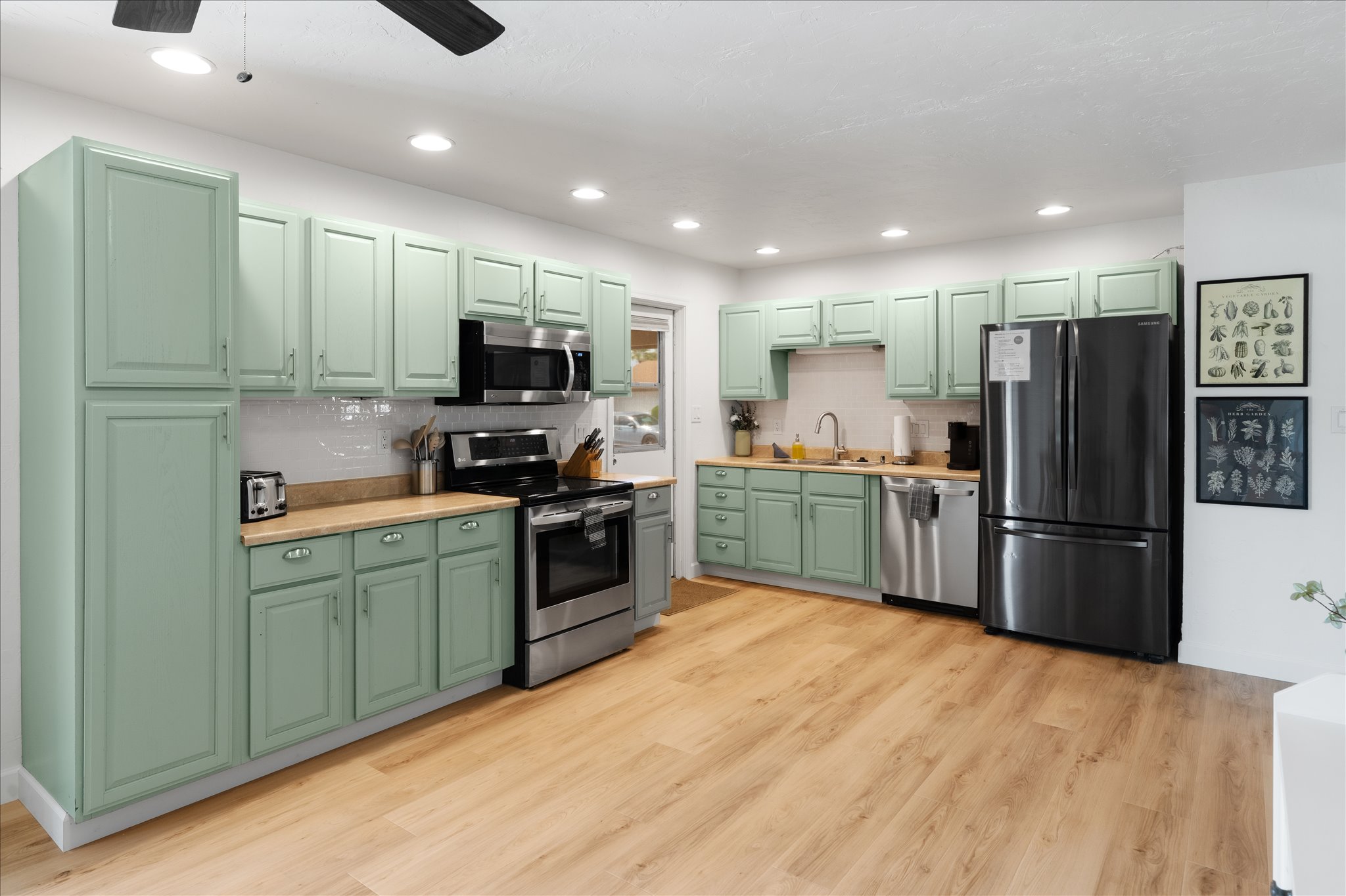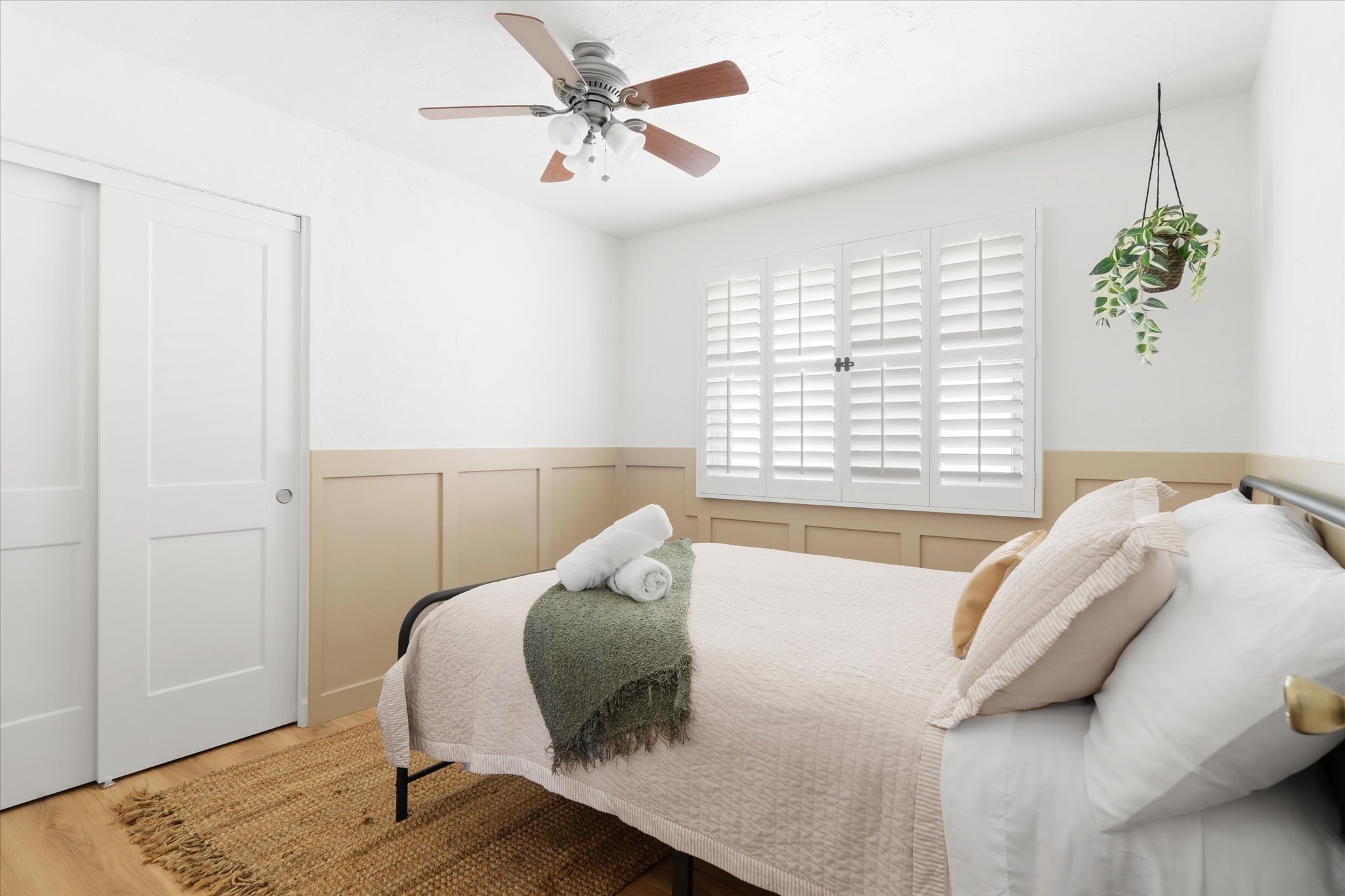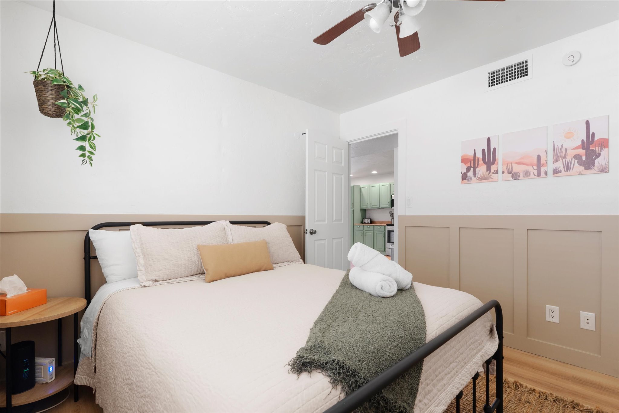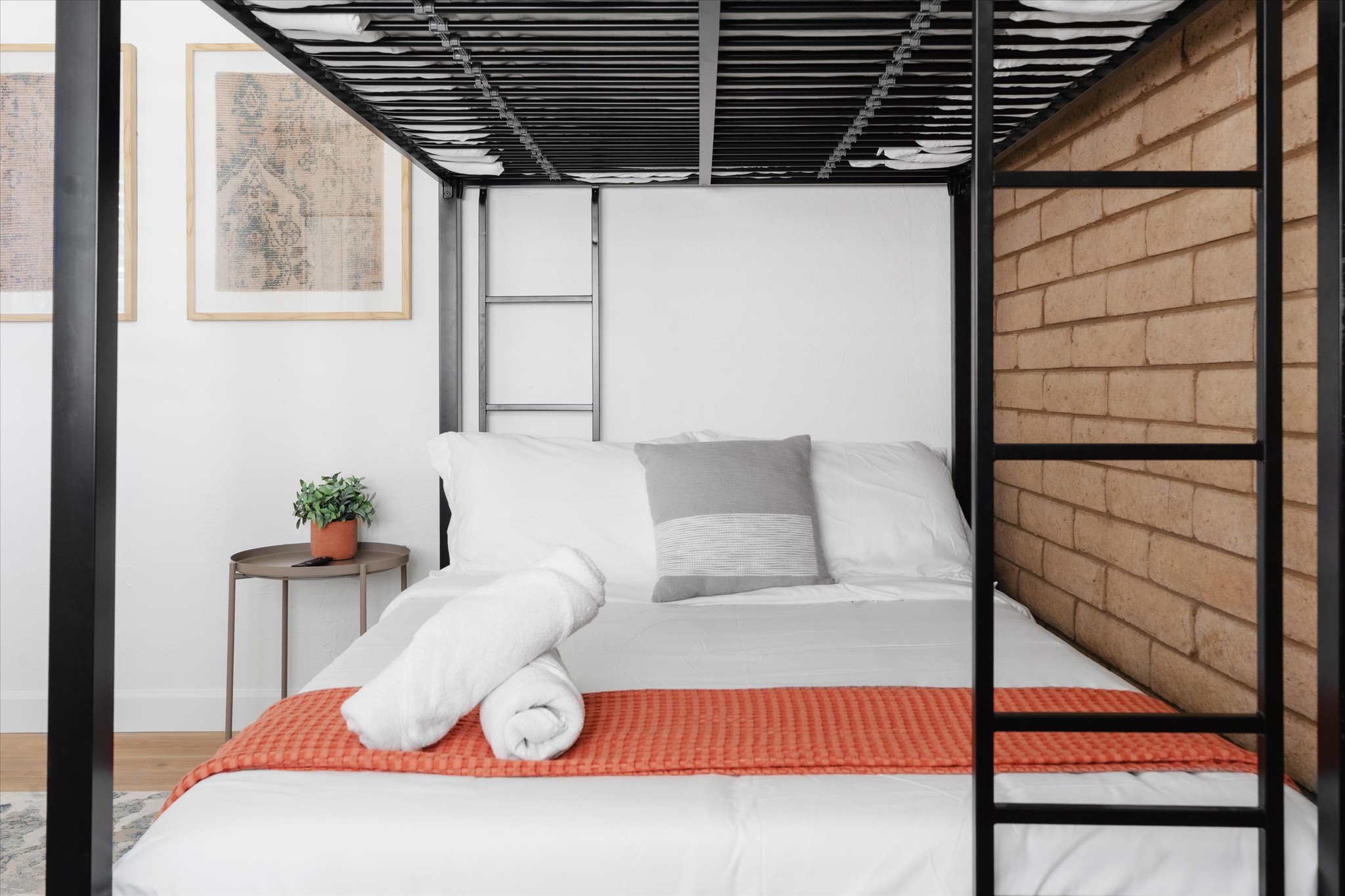 Why guests book this home: private pool, covered patio with outdoor TV, fenced dog-friendly yard, dedicated workspace, 300 Mbps Wi‑Fi, driveway parking, and flexible sleeping with 1 king, 1 queen, and a back bedroom with two queen bunk beds.